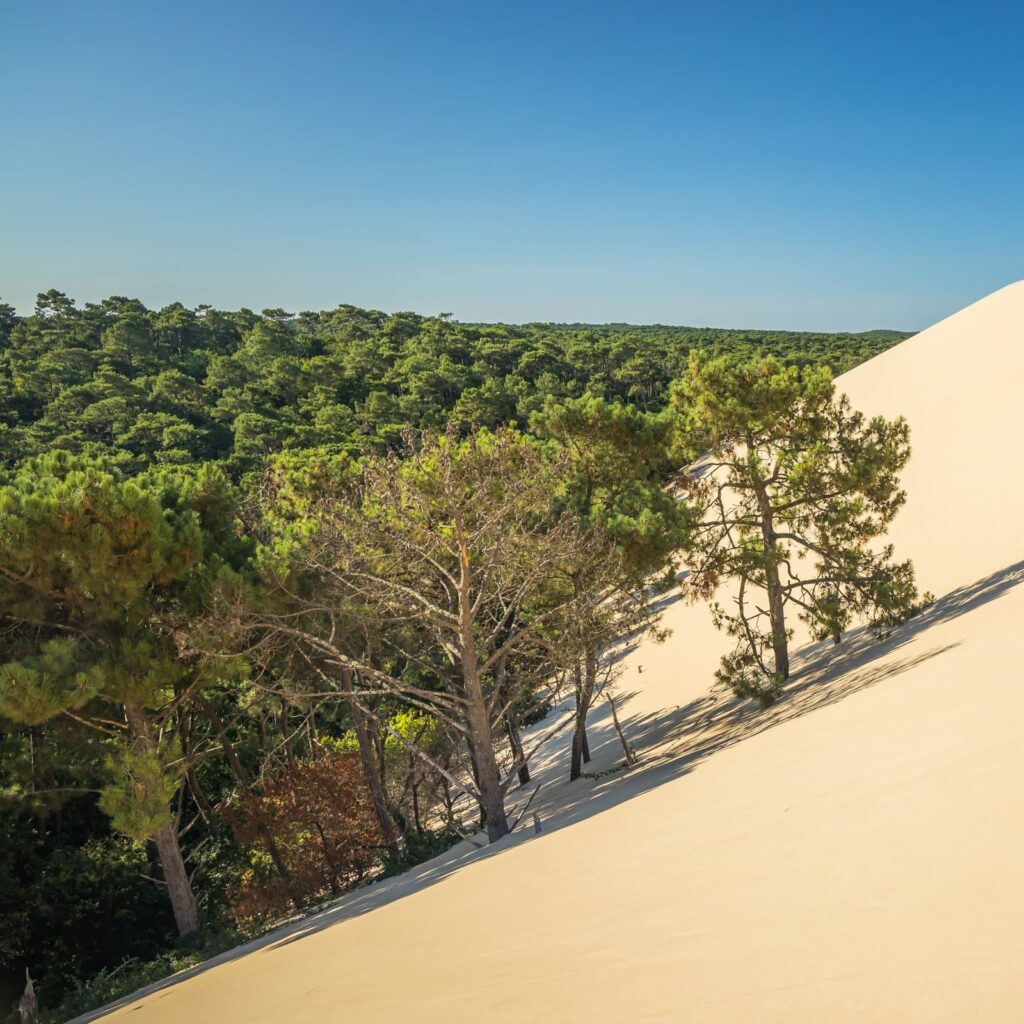 Etwas weiter südlich erhebt sich mit der Dune du Pilat die größte Wanderdüne Europas – ein beeindruckendes Naturhighlight an der französischen Atlantikküste mit spektakulärem Blick über das Meer, das Becken von Arcachon und die endlosen Pinienwälder der Landes.
