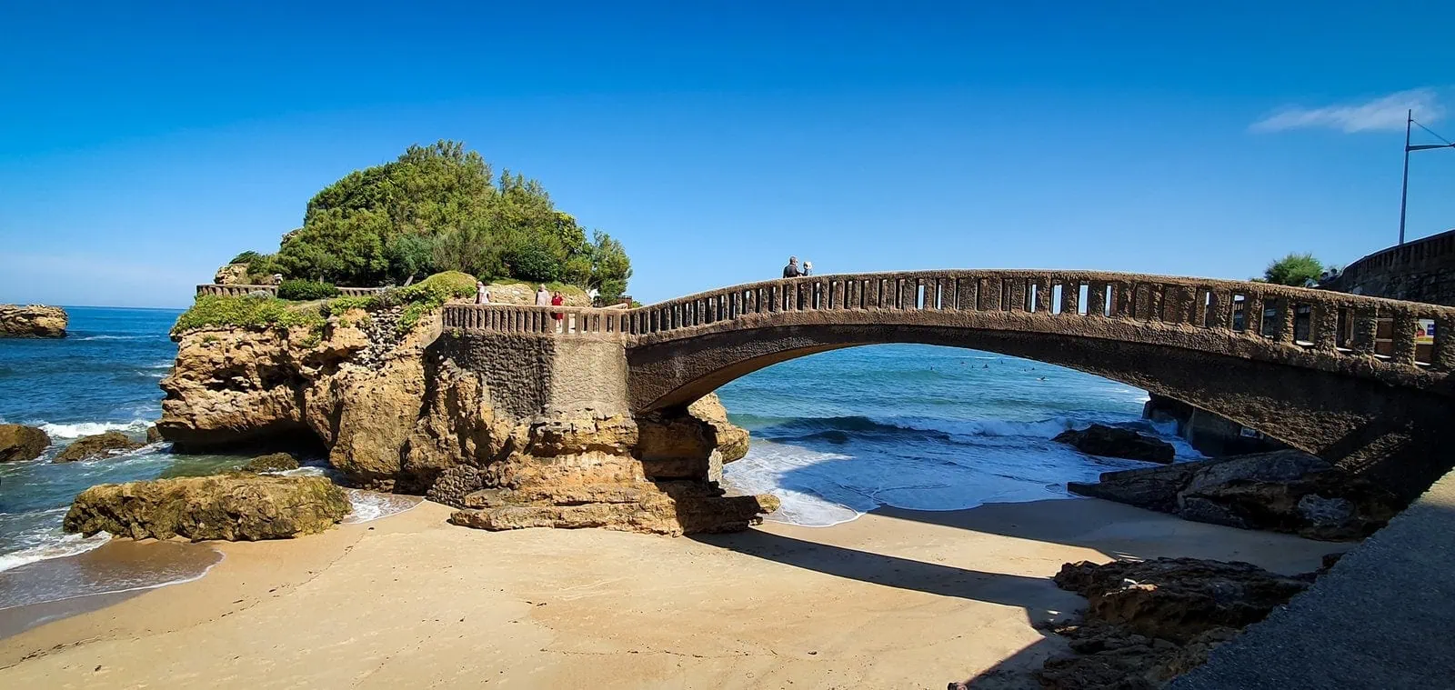 Eine von Gustave Eiffel entworfene Eisenbrücke verbindet den Rocher de la Vierge mit dem Festland und bietet einen spektakulären Blick auf die Stadt und das Meer. Von der Aussichtsplattform aus hat man einen atemberaubenden Blick auf den Atlantischen Ozean und die baskische Küste.Die Umgebung des Felsens ist von einer wunderschönen Promenade mit Hortensien und Tamarisken gesäumt.