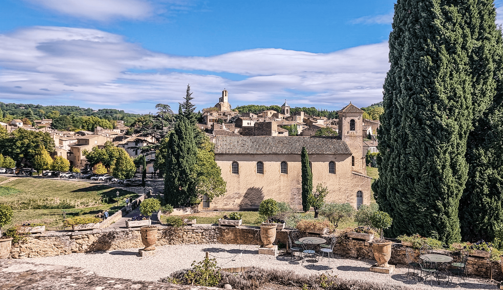 Vorbei an Galerien und kleinen Läden, die regionale Spezialitäten wie selbstgemachte Seifen, Olivenöle und Marmeladen anbieten, gelangt man zum Rathausplatz mit seinen kleinen gemütlichen Cafés. Weithin sichtbar ist der malerische Glockenturm, und vom Platz hinter der Dorfkirche hat man einen herrlichen Blick auf den Mont-Ventoux und die Ockerfelsen. Von 1942 bis 1945 versteckte sich hier Samuel Beckett vor der deutschen Wehrmacht und setzte dem Ort mit seinem Theaterstück „Warten auf Godot“ ein ganz besonderes Denkmal.
