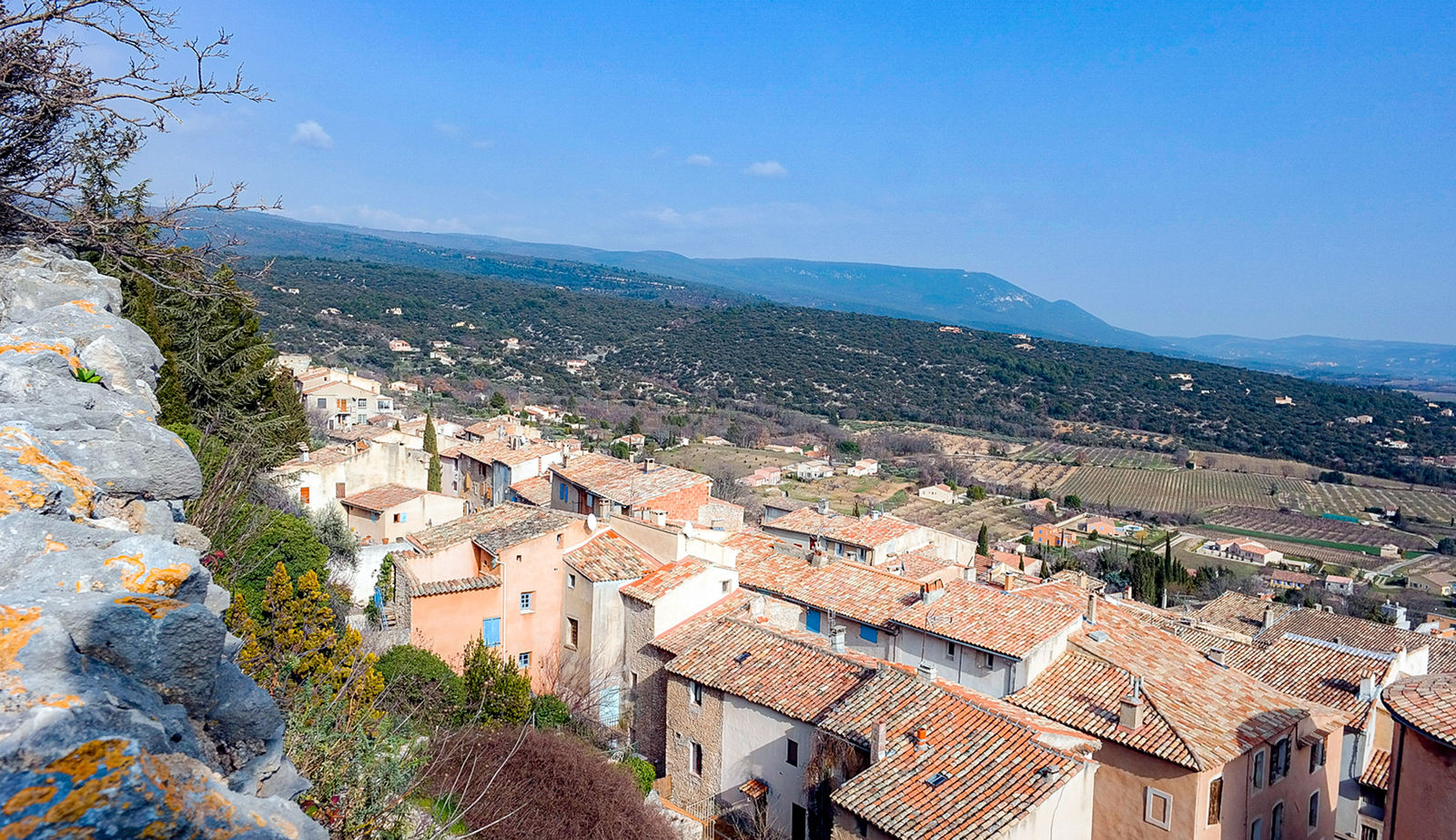 Das mittelalterliche Dorf liegt am Südhang der Monts de Vaucluse mit ihren steilen Hängen und tiefen Tälern in 350 bis 1.000 m Höhe, gut geschützt vor dem Mistral. Von hier aus bietet sich ein einzigartiger Blick auf den Luberon und das Cavalontal.