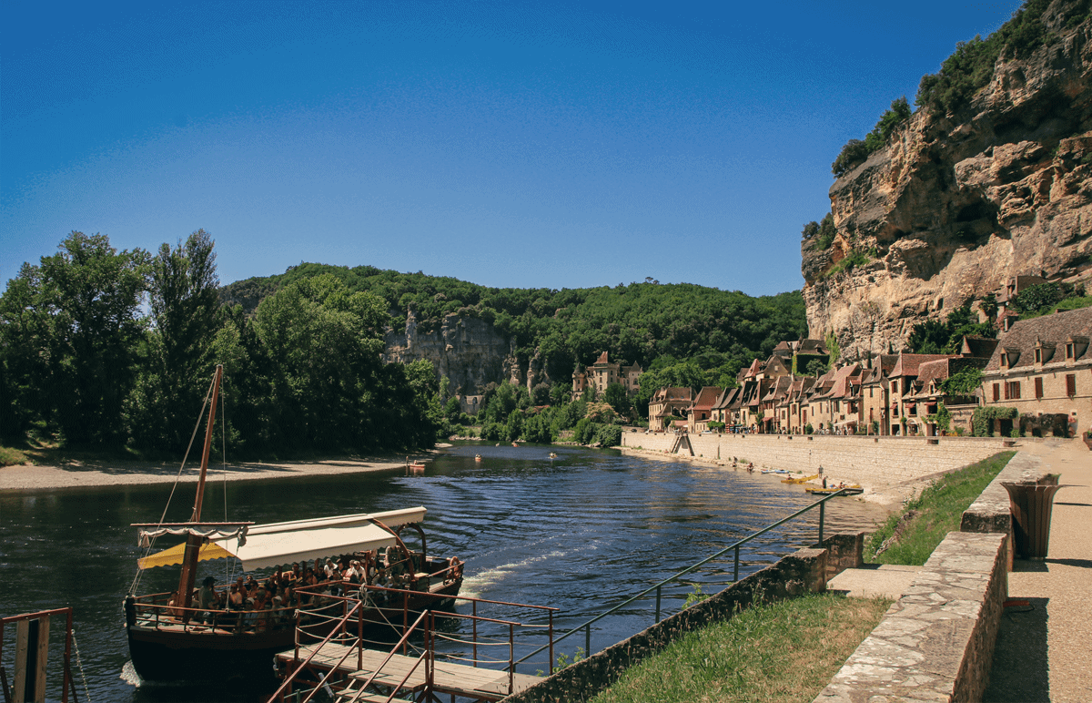 La Roque-Gageac sollte bei einem Besuch in Sarlat unbedingt auf dem Programm stehen. Die Schönheit und historische Bedeutung dieses „Plus Beaux Villages de France“ ist eng mit seiner einzigartigen Lage am Nordufer der Dordogne unter einer steilen Felswand verbunden. Schon in prähistorischer Zeit siedelten hier Menschen, und noch heute sind Reste einer alten gallo-römischen Straße sowie ein Brunnen aus dieser Zeit erhalten.