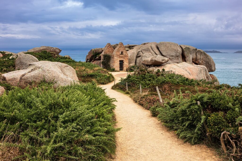 Die Côte de Granit Rose ist zweifellos eines der spektakulärsten Naturjuwelen der Bretagne. Sie erstreckt sich über etwa 30 Kilometer zwischen Perros-Guirec und Trébeurden und fasziniert mit ihren einzigartigen rosafarbenen Felsformationen, die vor über 300 Millionen Jahren entstanden sind. Wind, Wasser und Zeit haben diese Granitfelsen zu außergewöhnlichen Formen geschliffen, die an Tiere, Figuren oder mystische Wesen erinnern – ein Spiel der Fantasie vor der Kulisse des türkisfarbenen Meeres.