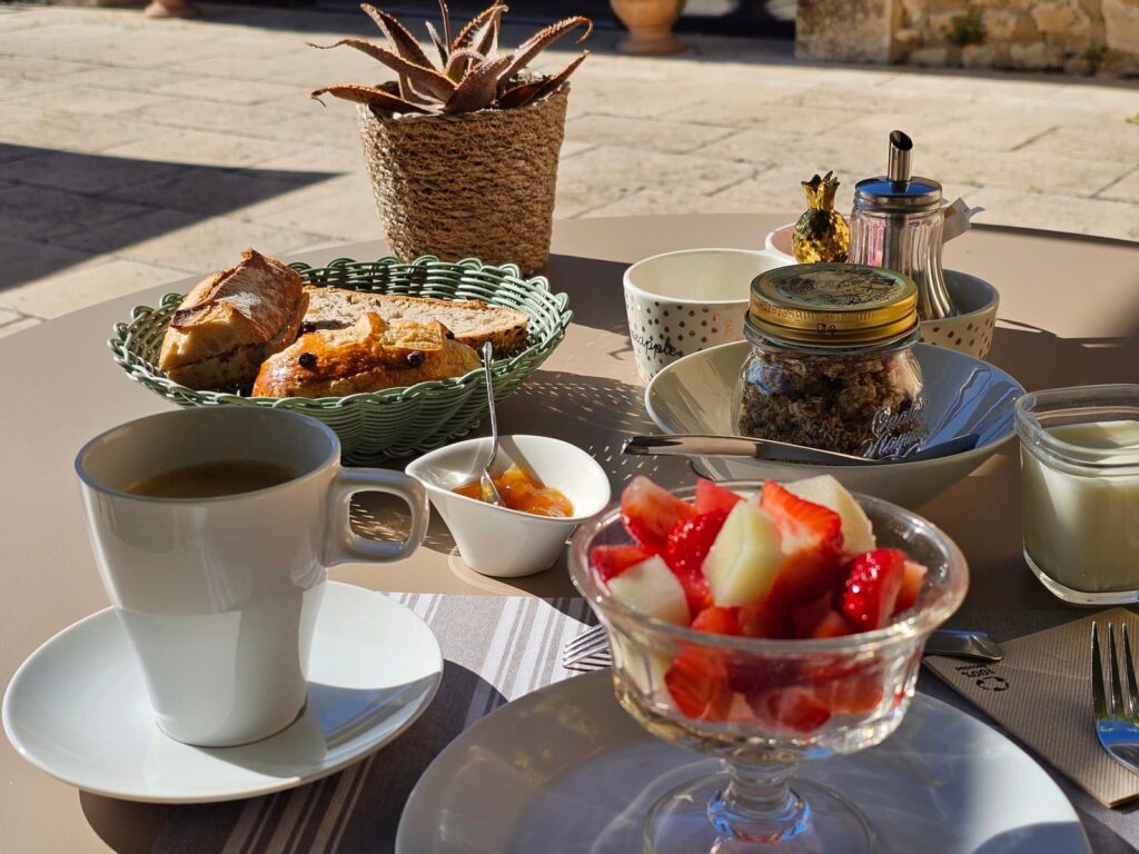 Der Frühstücksraum besticht durch seine einladenden Lounge-Ecke und den schönen Ausblick auf eine herrlichen Travertin Terrasse, die von einem Pool und einem Gartenbereich überragt wird. Auch das Frühstück selbst ist ein Hingucker: Es wird „à la carte“ angeboten. Neben Baguette, Marmelade und Croissants können Sie auch Käse, Wurst und Obst bestellen.